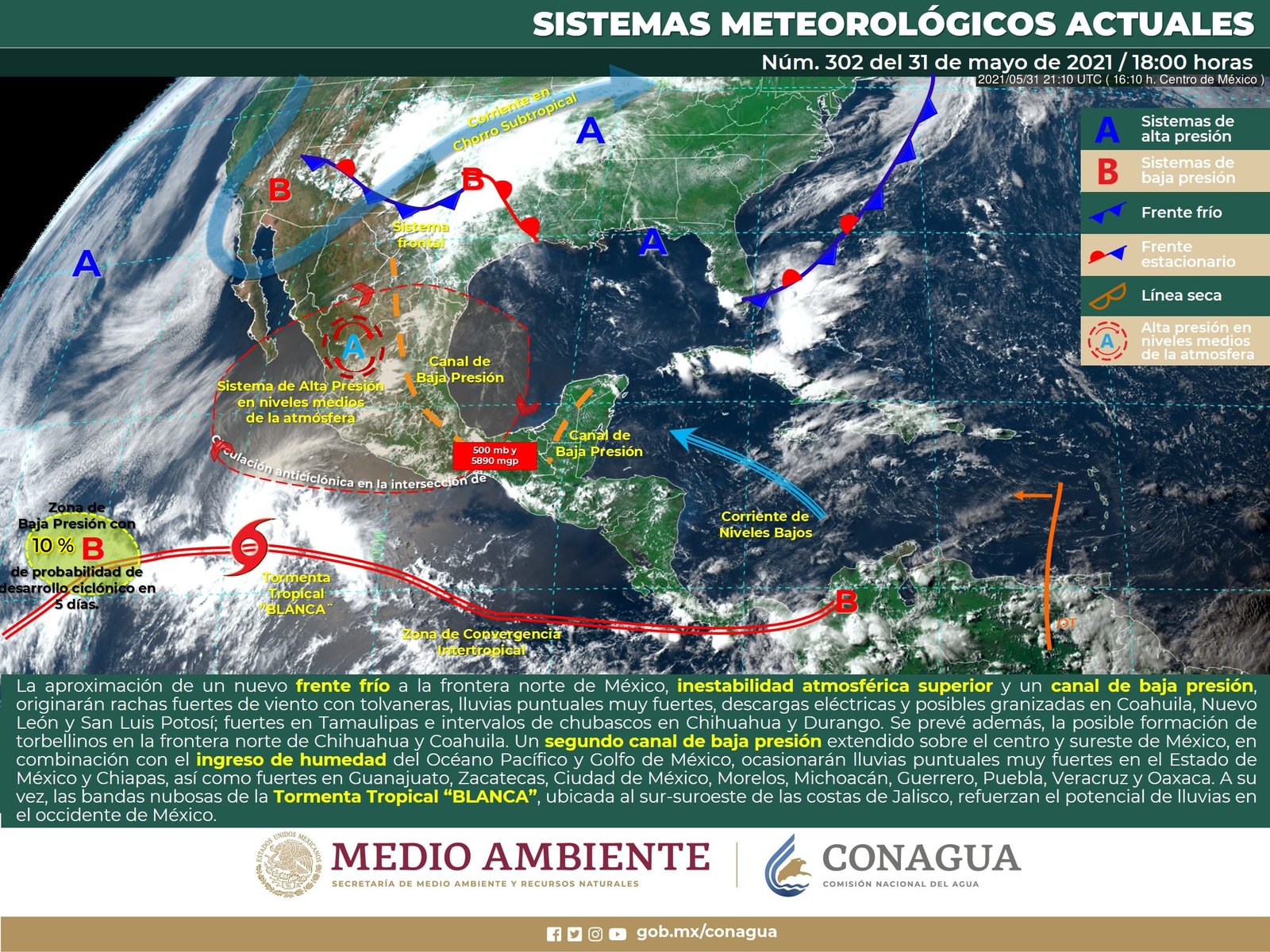 🔊 Escuchar esto Guanajuato mantendrá este martes nublados vespertinos y hasta 50 por ciento de probabilidad de tormentas dispersas con máximas de 30 grados, dio a conocer el Servicio Meteorológico Nacional (SMN). De acuerdo con su último reporte, el organismo dependiente de la Comisión Nacional del Agua (Conagua) pronostica que la Mesa Central del país tendrá cielo despejado por la mañana y nublado por la tarde con lluvias puntuales intensas en Puebla; fuertes en Morelos, Guanajuato y Querétaro, además de chubascos en Hidalgo y Tlaxcala. El día seguirá con ambiente fresco al amanecer y cálido a caluroso por la tarde con viento de dirección variable de 10 a 25 km/h y rachas de 50 km/h en zonas de tormenta. NUBLADO EN GUANAJUATO El reporte indica que Guanajuato continuará con nublados por la tarde y probabilidad de 45 a 50 por ciento de tormentas dispersas. Las temperaturas máximas promedio serán de 30 grados con algunas rachas de viento en municipios de León, Guanajuato capital, Dolores Hidalgo, Celaya, Comonfort, Pénjamo, Salamanca e Irapuato. Las mínimas serán de 15 a 16 grados. Los municipios del noreste, a su vez, tendrán nublados con mínimas de 26 grados y mínimas de 13 en la noche y madrugada. FRENTE FRÍO Y CANAL DE BAJA PRESIÓN EN EL NORTE Para el resto del país, el SMN dijo que un canal de baja presión en interacción con la cercanía de un frente frío y con divergencia en altura sobre el norte y noreste del país ocasionarán fuertes rachas de viento, chubascos y lluvias fuertes a puntuales muy fuertes acompañadas de descargas eléctricas y posibles granizadas. LLUVIAS EN EL OCCIDENTE Y CENTRO Canales de baja presión en combinación con la entrada de humedad del Océano Pacífico y Golfo de México, además de divergencia en altura, originarán chubascos y lluvias fuertes acompañadas de descargas eléctricas y posibles granizadas sobre entidades del occidente, centro, sur y sureste del territorio nacional. Una circulación anticiclónica en niveles medios de la atmósfera seguirá generando ambiente vespertino caluroso a muy caluroso sobre gran parte del país con temperaturas máximas de 35 a 40°C en estados del litoral del Pacífico, la Península de Yucatán y litoral del Golfo de México. SE ALEJA DEPRESIÓN TROPICAL Finalmente, la depresión tropical “Dos-E” en el Océano Pacífico se desplazará hacia el oeste, alejándose paulatinamente de las costas mexicanas. Los sistemas meteorológicos ocasionarán este martes: Lluvias muy fuertes con lluvias puntuales intensas (75. 1 a 150.0 mm) en Coahuila, Nuevo León, Tamaulipas, San Luis Potosí, Zacatecas, Puebla y Oaxaca. Lluvias fuertes con lluvias puntuales muy fuertes (50.1 a 75.0 mm) en Morelos, Estado de México y Guerrero. Intervalos de chubascos con lluvias puntuales fuertes (25.1 a 50.0 mm) en Chihuahua, Durango, Jalisco, Guanajuato, Querétaro, Michoacán, Veracruz y Chiapas. Intervalos de chubascos (5.1 a 25.0 mm) en Aguascalientes, Colima, Hidalgo, Ciudad de México y Tlaxcala. Lluvias aisladas (0.1 a 5.0 mm) en Sinaloa, Nayarit, Tabasco, Campeche, Yucatán y Quintana Roo. Posibilidad de tormentas eléctricas en Chihuahua, Coahuila, Nuevo León, Tamaulipas, Sinaloa, Zacatecas, Durango, San Luis Potosí, Aguascalientes, Nayarit, Jalisco, Colima, Michoacán, Guerrero, Guanajuato, Querétaro, Estado de México, Ciudad de México, Morelos, Puebla, Veracruz, Oaxaca, Chiapas, Yucatán y Quintana Roo. Viento con rachas de 60 a 70 km/h y tolvaneras en Chihuahua, y con posible formación de torbellinos: Coahuila, Nuevo León y Tamaulipas. Viento con rachas de 50 a 60 km/h en Durango, Zacatecas, San Luis Potosí, Jalisco, Aguascalientes, Campeche y Yucatán. Temperaturas máximas de 35 a 40 °C en Baja California, Baja California Sur, Sonora, Nuevo León, Tamaulipas, San Luis Potosí, Sinaloa, Nayarit, Jalisco, Colima, Michoacán, Guerrero, Oaxaca, Chiapas, Veracruz, Tabasco, Campeche, Yucatán y Quintana Roo. Temperaturas mínimas para la madrugada del miércoles de 0 a 5 °C y posibles heladas en zonas montañosas de Chihuahua y Durango. Compartir