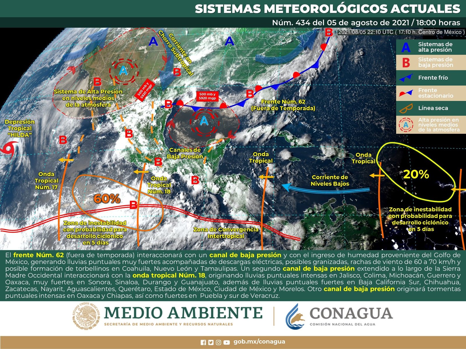 🔊 Escuchar esto Guanajuato continuará este viernes con probabilidad de lluvia durante la tarde y noche al continuar bajo los efectos de la onda tropical 18 y un canal de baja presión, dio a conocer el Servicio Meteorológico Nacional (SMN). De acuerdo con su último reporte, el organismo dependiente de la Conagua pronostica que la Mesa Central del país tendrá cielo medio nublado por la mañana e incremento de nublados por la tarde con lluvias puntuales fuertes en Guanajuato, chubascos en Morelos y Puebla, así como lluvias aisladas en Querétaro, Hidalgo y Tlaxcala, todas acompañadas de descargas eléctricas y posible caída de granizo. El viento del este de 10 a 25 km/h en la región llegará con rachas de hasta 50 km/h en zonas de tormenta. CHUBASCOS NOCTURNOS EN GUANAJUATO El reporte indica que Guanajuato tendrá temperaturas máximas promedio de 26 y 27 grados a lo largo del día con viento vespertino. Con excepción de los municipios del noreste, la mayor parte del estado tiene probabilidad de 50 a 60 por ciento de lluvias vespertinas con intervalos durante la noche. Se esperan rachas de viento y nublados por la mañana y a lo largo de la tarde con temperaturas mínimas promedio de 13 y 14 grados durante la noche y madrugada del sábado. Los municipios del noreste son los que tienen probabilidad de 30-40 por ciento de probabilidad de lluvia. ONDA TROPICAL SIGUE EN EL CENTRO Para el resto del país, el SMN reporta que un canal de baja presión que se extiende a lo largo de la Sierra Madre Occidental seguirá interactuando con el paso de la onda tropical Núm. 18. Estos fenómenos recorrerán el occidente y centro del territorio nacional, aunado con divergencia en altura, lo que propiciará lluvias fuertes a muy fuertes acompañadas de descargas eléctricas y posible caída de granizo sobre el noroeste, occidente, centro y sur del país, con tormentas puntuales intensas en Jalisco, Colima, Michoacán y Guerrero. LLUVIAS EN EL SUR Por otra parte, un canal de baja presión sobre el sureste del país, en combinación con el ingreso de humedad del Golfo de México, incrementará la probabilidad de chubascos y lluvias fuertes a muy fuertes, descargas eléctricas y posibles granizadas en el oriente y sureste del país, además de lluvias puntuales intensas en Oaxaca y Chiapas. CALORÓN SIN CAMBIOS EN EL NORTE Y SUR Finalmente, se mantendrá el ambiente caluroso a muy caluroso sobre entidades del noroeste, occidente, norte, noreste y oriente de México, así como en la Península de Yucatán, con temperaturas máximas de 40°C a 45°C en el noroeste de Sonora, pudiendo superar los 45°C en el norte de Baja California. Los fenómenos meteorológicos mencionados ocasionarán este viernes: Lluvias muy fuertes con lluvias puntuales intensas (75.1 a 150.0 mm) en los estados de Colima, Michoacán y Guerrero. Lluvias fuertes con lluvias puntuales muy fuertes (50.1 a 75.0 mm) en Sonora, Sinaloa, Durango, Nayarit, Jalisco, Oaxaca y Chiapas. Intervalos de chubascos con lluvias puntuales fuertes (25.1 a 50.0 mm) en Chihuahua, Zacatecas, Aguascalientes, Guanajuato, Estado de México, Veracruz, Tabasco, Campeche y Yucatán. Intervalos de chubascos (5.1 a 25.0 mm) en Baja California Sur, Coahuila, Nuevo León, Tamaulipas, Querétaro, Ciudad de México, Morelos, Puebla y Quintana Roo. Lluvias aisladas (0.1 a 5.0 mm) en San Luis Potosí, Hidalgo y Tlaxcala. Posible caída de granizo en Chihuahua, Durango, Jalisco, Colima, Michoacán, Estado de México, Ciudad de México, Morelos y Puebla. Posibilidad de tormentas eléctricas en Baja California Sur, Sonora, Chihuahua, Durango, Sinaloa, Coahuila, Nuevo León, Tamaulipas, Zacatecas, Aguascalientes, Nayarit, Jalisco, Colima, Michoacán, Guanajuato, Estado de México, Ciudad de México, Morelos, Puebla, Guerrero, Oaxaca, Chiapas, Veracruz, Tabasco, Campeche, Yucatán y Quintana Roo. Viento con rachas de 50 a 60 km/h en Sonora, Coahuila, Nuevo León, Tamaulipas, San Luis Potosí, Zacatecas, Campeche, Yucatán, Quintana Roo y el Golfo de California. Temperaturas máximas de 40 a 45 °C en Baja California y Sonora. Temperaturas máximas de 35 a 40 °C en Baja California Sur, Sinaloa, Chihuahua, Coahuila, Nuevo León, Tamaulipas, San Luis Potosí (oriente), Veracruz (norte), Tabasco, Campeche, Yucatán y Quintana Roo, además de costas de Jalisco, Colima, Michoacán y Chiapas. Temperaturas mínimas para la madrugada del sábado de 0 a 5 °C y posibles heladas en zonas montañosas de Chihuahua, Durango, Estado de México, Hidalgo, Tlaxcala y Puebla. Compartir