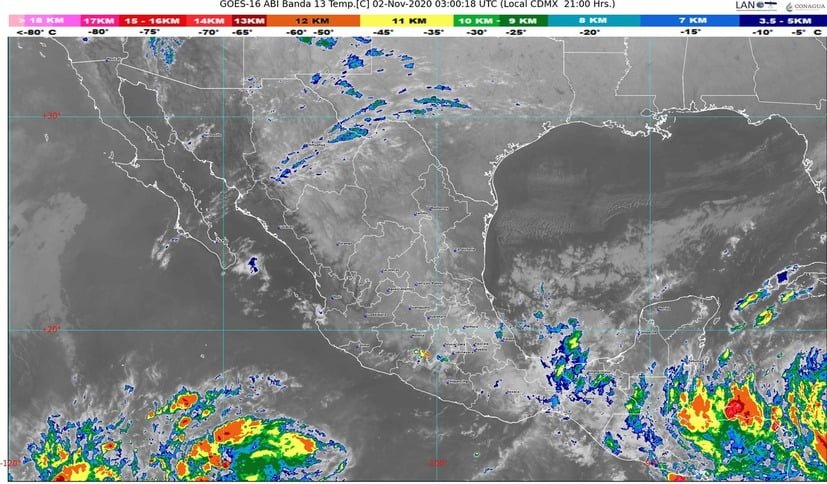 🔊 Escuchar esto Este lunes, Guanajuato seguirá bajo los efectos del frente frío 11 con heladas nocturnas, dio a conocer el Servicio Meteorológico Nacional (SMN). De acuerdo con su último reporte, el organismo dependiente de la Comisión Nacional del Agua (Conagua) prevé que para la Mesa Central del país se presente cielo medio nublado por la tarde con lluvias puntuales fuertes en Puebla. Intervalos de chubascos en Hidalgo, así como lluvias aisladas en Querétaro. Se estima ambiente frío con heladas matutinas en zonas serranas y caluroso por la tarde. Viento del este y noreste con rachas de 50 a 60 km/h en Guanajuato y Puebla. SIGUEN RACHAS DE VIENTO EN GUANAJUATO La mayoría de los municipios de Guanajuato tendrán temperaturas máximas de 22 grados con cielos despejados acompañados de fuertes rachas de viento. Las zonas altas del estado y del noreste tendrán máximas de 16 grados y las mínimas oscilarán entre los 4 y 6 grados durante la madrugada y noche. FRENTE FRÍO ESTACIONARIO Para el resto del país, el SMN prevé que el frente frío No. 11 se extenderá con características de estacionario sobre la Península de Yucatán y el sureste de México. Este fenómeno interaccionará con una nueva onda tropical que se aproximará al sur de Quintana Roo, generando lluvias fuertes a puntuales intensas en dichas regiones. La masa de aire frío que impulsará al frente, continuará generando ambiente frío a muy frío con heladas matutinas en estados de la Mesa del Norte y la Mesa Central. BANCOS DE NIEBLA También se esperan bancos de niebla en el oriente del país, evento de “Norte” con rachas de 90 a 110 km/h en el Istmo y Golfo de Tehuantepec, de 70 a 90 km/h en la costa centro y sur de Veracruz, de 60 a 70 km/h en las costas de Tabasco, Campeche, Yucatán y Quintana Roo, y de 50 a 670 km/h en las costas de Tamaulipas. Además, se espera oleaje de 3 a 5 metros de altura significativa en el Golfo de Tehuantepec, de 2 a 4 metros de altura significativa en las costas de Veracruz, Tabasco, Campeche, Yucatán y Quintana Roo (norte) y de 1 a 3 metros de altura significativa en las costas de Tamaulipas. SE APROXIMA TORMENTA La Tormenta Tropical “Eta” del Mar Caribe se aproximará a las costas de Nicaragua, mientras que la zona de inestabilidad con alto potencial ciclónico en el Océano Pacífico se localizará al sur-suroeste de Baja California Sur. Los sistemas meteorológicos ocasionarán: Lluvias muy fuertes con lluvias puntuales intensas (75 a 150 mm) acompañadas de descargas eléctricas, granizadas y rachas fuertes de viento durante las tormentas en Veracruz (sur), Oaxaca (oriente), Chiapas (norte) y Tabasco. Lluvias fuertes con lluvias puntuales muy fuertes (50 a 75 mm) acompañadas de descargas eléctricas, granizadas y rachas fuertes de viento durante las tormentas en Campeche y Quintana Roo. Intervalos de chubascos con lluvias puntuales fuertes (25 a 50 mm) acompañados de descargas eléctricas y rachas fuertes de viento durante las tormentas en Puebla y Yucatán. Intervalos de chubascos (5.1 a 25 mm) acompañados de descargas eléctricas y rachas fuertes de viento durante las tormentas en Hidalgo. Lluvias aisladas (0.1 a 5 mm) en Tamaulipas, San Luis Potosí, Querétaro y Michoacán. PEGA EVENTO NORTE Evento de “Norte” con rachas de 90 a 110 km/h en el Istmo y Golfo de Tehuantepec, de 70 a 90 km/h en la costa centro y sur de Veracruz, de 60 a 70 km/h en las costas de Tabasco, Campeche, Yucatán y Quintana Roo, y de 50 a 60 km/h en las costas de Tamaulipas. Oleaje de 3 a 5 metros de altura significativa en Golfo de Tehuantepec, oleaje de 2 a 4 metros de altura significativa: costas de Veracruz, Tabasco, Campeche, Yucatán y Quintana Roo (norte) y oleaje de 1 a 3 metros de altura significativa en costas de Tamaulipas. Viento con rachas de 50 a 60 km/h en San Luis Potosí, Zacatecas, Aguascalientes, Jalisco, Guanajuato y Puebla. Temperaturas máximas de 35°C a 40°C en Baja California Sur, Sonora, Sinaloa, Nayarit, Jalisco, Michoacán y Guerrero. Temperaturas mínimas para la madrugada del martes de -5 a 0°C con heladas en zonas montañosas de Chihuahua, Durango y Estado de México. Temperaturas mínimas para la madrugada del martes de 0 a 5°C y posibles heladas en zonas montañosas de Baja California, Sonora, Coahuila, Nuevo León, Tamaulipas, San Luis Potosí, Zacatecas, Aguascalientes, Jalisco, Michoacán, Guanajuato, Querétaro, Hidalgo, Tlaxcala, Puebla, Veracruz y Oaxaca. Compartir