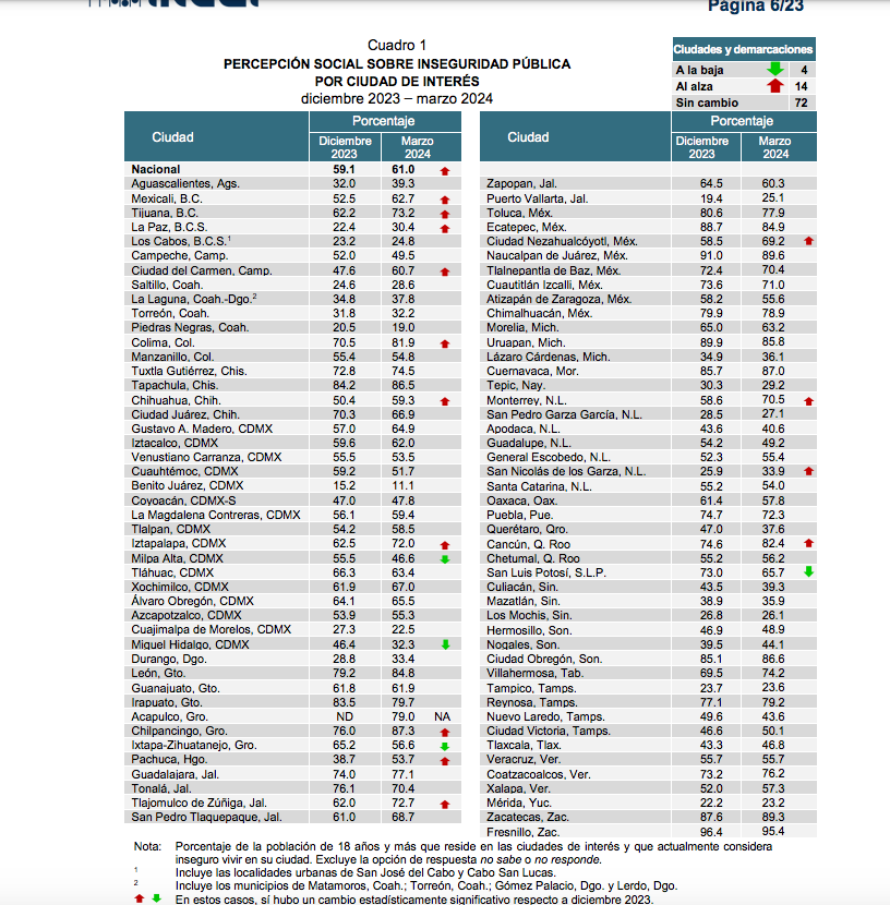 En el periodo de diciembre de 2023 a marzo de 2024, la percepción de inseguridad en León pasó de 79.5 por ciento en diciembre a 84.8 por ciento, es decir, un aumento de 5.3 por ciento.