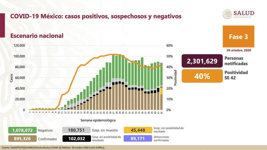 🔊 Escuchar esto La Secretaría de Salud federal reportó la noche de este lunes 247 muertes más por coronavirus Covid-19 en el país, con lo que suman 89 mil 171, mientras que la cifra de casos acumulados llegó a 895 mil 326, 4 mil 166 más que el domingo. La Secretaría de Salud de Guanajuato (SSG) informó a su vez de 20 defunciones más en el último día para sumar 3 mil 266. En conferencia, el director de Epidemiología federal, José Luis Alomía, informó que hay 45 mil 448 casos sospechosos con posibilidad de resultado, un millón 78 mil 072 negativos y un total de dos millones 301 mil 629 personas estudiadas desde el primer caso registrado en México. Dijo que la proporción de las personas que han dado positivo a la prueba de Covid-19 se ubicó en 40 por ciento en la semana 42. “Vemos una disminución que ocurrió en el porcentaje de positividad entre la semana 41 y 42, pero aún no llega a los niveles más bajos que en algún momento habíamos tenido en semanas previas como en la 39 y 40”, dijo. En el día 149 del regreso a la “nueva normalidad”, las autoridades sanitarias dieron a conocer que se estima que 45 mil 896 (4 por ciento) pacientes presentaron síntomas en los últimos 14 días, lo cual representa a personas que potencialmente contribuyen a la transmisión del virus. En cuanto a los fallecimientos causados por la enfermedad, se observó un incremento de 5 por ciento, es decir, 108 defunciones más de las que se habían presentado en la semana 41. “Lamentablemente, la gran mayoría, un poco más de 100, están registradas en Chihuahua, donde sabemos que están teniendo un rebrote importante de la enfermedad”, apuntó el funcionario. Adicionalmente, se registró un descenso en las defunciones de 56 por ciento desde la semana epidemiológica número 28, en la cual se confirmaron 5 mil 392 muertes causadas por el virus SARS-CoV-2. Los casos confirmados en el mundo son 43 millones 421 mil 678, de acuerdo con la Universidad Johns Hopkins. BAJAN CONTAGIOS EN GUANAJUATO Por su parte, la Secretaría de Salud de Guanajuato (SSG) reportó un descenso en los contagios por Covid-19 en comparación con los últimos días. La dependencia reportó 123 contagios en las últimas 24 horas para sumar 48 mil 682 casos acumulados desde que llegó la pandemia. En cuanto a decesos, se reportaron 20 más en el último día para sumar 3 mil 266 en total. El reporte indicó que 2 mil 847 casos se encuentran bajo investigación, mientras que son ya 67 mil 698 casos los descartados. Las defunciones por municipio quedan así: León 1,171 Irapuato 321 Celaya 304 Salamanca 195 Silao 172 Guanajuato capital 88 Sn. Luis de la Paz 73 Cortazar 71 Sn. Fco. Del Rincón 68 Dolores Hidalgo 60 Valle de Santiago 56 Pénjamo 54 Salvatierra 53 Juventino Rosas 47 Villagrán 40 Acámbaro 39 Apaseo el Grande 38 Romita 38 Sn. Miguel de Allende 35 San Felipe 33 Abasolo 32 Purísima del Rincón 28 Comonfort 25 Yuriria 25 San José Iturbide 23 Manuel Doblado 22 Uriangato 20 Moroleón 19 Apaseo el Alto 16 Jaral del Progreso 16 Ocampo 12 Cuerámaro 11 Huanímaro 9 Jerécuaro 8 Sn. Diego de la Unión 8 Doctor Mora 7 Tarimoro 6 Santiago Maravatío 5 Victoria 5 Tarandacuao 4 Tierra Blanca 4 Xichú 3 Pueblo Nuevo 2 Compartir