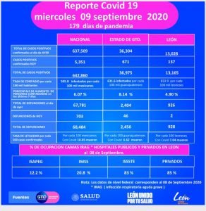 🔊 Escuchar esto La Secretaría de Salud federal informó la noche de este miércoles 611 nuevas muertes por coronavirus Covid-19, con lo que suman 69 mil 95 en México, mientras que el total de casos acumulados llegó a 647 mil 507, 4 mil 647 más que el martes. La Secretaría de Salud de Guanajuato (SSG) informó a su vez de 46 nuevas defunciones en las últimas 24 horas para llegar a 2 mil 450. En conferencia, el director de Epidemiología federal, José Luis Alomía, dio a conocer que se estima que 39 mil 994 (6 por ciento) pacientes presentaron síntomas en los últimos catorce días, lo cual representa a personas que potencialmente contribuyen a la transmisión del virus. Alomía Zegarra explicó que de la semana 34 a la 35 se registró un decremento de 9 por ciento en casos estimados (suma de contagios confirmados y sospechosos) a nivel nacional, contabilizándose 39 mil 994, hasta el último corte. En la curva de recuperados, en el mismo periodo, hubo un ligero aumento de 2 por ciento. A su vez, informó que la proporción de las personas que han dado positivo a la prueba de Covid-19 de las un millón 465 mil 693 estudiadas en el país, se ubicó en 41 por ciento para la semana 35. Respecto a las defunciones estimadas (70 mil 818) se observa una reducción de 41 por ciento en su ocurrencia. Asimismo, se han contabilizado 734 mil 649 casos negativos, 83 mil 537 sospechosos y 454 mil 982 recuperados. En la ocupación y disponibilidad hospitalaria hasta el 9 de septiembre, la Red IRAG reportó que existen 20 mil 803 (67 por ciento) camas generales disponibles y 10 mil 375 (33 por ciento) ocupadas. Con ventilador, a 7 mil 738 pueden acceder los enfermos ante las 2 mil 919 o el 27 por ciento de ocupación. Conforme a los datos de la Secretaria de Salud federal, hasta el último corte, la entidad con mayor ocupación en camas de hospitalización general es Colima, pues tiene una ocupación de 59 por ciento. En cuanto a la atención con ventiladores, Nuevo León se posicionó a la cabeza con 44 por ciento de saturación; le siguen Aguascalientes con 43 por ciento, Ciudad de México con 41 por ciento, Baja California con 35 por ciento y Puebla con 33 por ciento. Los casos confirmados en el mundo son 27 millones 699 mil 112, de acuerdo con la Universidad Johns Hopkins. GUANAJUATO CERCA DE LOS 37 MIL CONTAGIOS La Secretaría de Salud de Guanajuato (SSG) dio a conocer en su última actualización 671 nuevos casos confirmados de Covid-19 por lo que el total llegó a 36 mil 975 casos positivos. Asimismo, reportó 46 muertes en las últimas 24 horas con lo que la cifra de defunciones por Covid llegó a 2 mil 450. Por municipios, León sigue a la cabeza de contagios y muertes con 13 mil 165 y 928 muertos, seguido de Irapuato con 4 mil 126 y 251, respectivamente. Esta última demarcación registró un importante repunte de decesos en las últimas 24 horas con 9 víctimas. Las defunciones por municipio quedan así: León 928 Irapuato 251 Celaya 226 Silao 148 Salamanca 130 Guanajuato capital 69 Sn. Fco. Del Rincón 52 Cortazar 50 Sn. Luis de la Paz 46 Dolores Hidalgo 43 Pénjamo 41 Valle de Santiago 40 Juventino Rosas 38 Romita 35 Salvatierra 34 Villagrán 31 Apaseo el Grande 24 Acámbaro 23 Sn. Miguel de Allende 23 Abasolo 20 Purísima del Rincón 17 San Felipe 17 San José Iturbide 16 Comonfort 15 Moroleón 15 Uriangato 13 Yuriria 13 Manuel Doblado 12 Apaseo el Alto 10 Jaral del Progreso 9 Ocampo 8 Huanímaro 7 Doctor Mora 6 Sn. Diego de la Unión 6 Tarimoro 6 Cuerámaro 5 Jerécuaro 5 Tarandacuao 4 Tierra Blanca 4 Santiago Maravatío 3 Victoria 3 Xichú 3 Pueblo Nuevo 1 Compartir