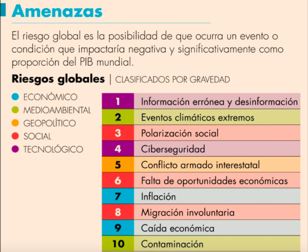 La desinformación constituye uno de los riesgos más grandes para la humanidad en este año cuando millones en el mundo acudirán a las urnas, incluido México. La advertencia está contenida en un estudio del Foro Económico Mundial (WEF) de Davos, que destaca el efecto nocivo que puede tener en los procesos electorales. Una crisis persistente del costo de la vida, el impacto de la desinformación alimentada por la Inteligencia Artificial (IA) y la polarización social son los mayores riesgos que enfrenta el mundo para este año, revelaron expertos reunidos en el mencionado Foro. En su reporte anual sobre Riesgos Globales se refiere a las amenazas reales ante la proximidad de los procesos electorales en países como México, Estados Unidos, Indonesia y Reino Unido. CONFLICTOS ¿A LA VISTA? “Cerca de 3 mil millones de personas acudirán a las urnas electorales en varias economías –en los próximos dos años–, incluidos Estados Unidos, India, Reino Unido, México e Indonesia”, indicaron los expertos. “La presencia de desinformación en estos procesos electorales podría desestabilizar gravemente la legitimidad real y percibida de los gobiernos recién elegidos, generando violencia, terrorismo y una erosión a largo plazo de los procesos democráticos”, advirtieron. Los expertos del WEF sostuvieron que “los disturbios resultantes podrían variar desde protestas violentas y crímenes de odio hasta enfrentamientos civiles y terrorismo”. NECESARIO APLICAR MEDIDAS En el documento, divulgado antes del arranque el Foro de Davos que reunirá a más de 2 mil líderes mundiales, detallaron que “existe una preocupación particular en aquellos países que enfrentan próximas elecciones donde podría ser necesario tomar medidas enérgicas ante la posible interferencia extranjera, real o percibida”. Como sucede cada año, los expertos en riesgos globales, responsables políticos y líderes del sector asegurador consultados por el WEF identificaron los 10 riesgos más severos que pueden presentarse en un lapso de dos años para los sectores económico, del medioambiente, geopolítico, social y tecnológico. LOS 10 RIESGOS Los riesgos más severos son: Desinformación Fenómenos climáticos extremos Polarización de la sociedad Inseguridad cibernética Conflicto armado interestatal Falta de oportunidades económicas Inflación Migración involuntaria Recesión económica Contaminación Para los próximos 10 años, dos tercios de los expertos mundiales identificaron cinco fenómenos extremos ligados al cambio climático, entre los 10 que esperan. (Fotos y gráfico: Tomados de Debate y El Economista) Compartir Navegación de entradas Alarmante cifra en León: hay 3 mil narcotienditas Fondos Guanajuato supera meta de créditos