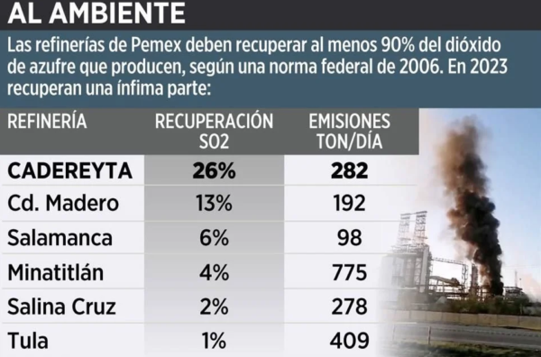 Todas las refinerías de Pemex, incluida la de Salamanca, Guanajuato, incumplen con las normas oficiales del Gobierno federal para capturar el dióxido de azufre (SO2) que producen. Así quedó demostrado en un estudio llevado a cabo por los académicos Francisco Barnés de Castro y Alejandro Villalobos Hiriart, consignó el diario Reforma. El análisis, publicado en el sitio “Energía a debate”, que realizaron los especialistas con los informes mensuales de Pemex y la Secretaría de Energía (Sener) sobre la producción de azufre de sus seis refinerías no deja dudas: las plantas envenenan el ambiente. En 2006, la Semarnat emitió una norma oficial respecto a la recuperación de azufre en las refinerías, que debe de ser igual o mayor al 90 por ciento de sus emisiones, lo que no se cumple, como revelan datos de 2023: VENENO AL AMBIENTE Cadereyta recuperó 26 por ciento del dióxido de azufre que produjo, emitiendo 282 toneladas por día de este gas dañino a la atmósfera. Ciudad Madero recuperó 13 por ciento, emitiendo 192 toneladas por día. Salamanca recuperó 6 por ciento, emitiendo 98 toneladas por día. Minatitlán recuperó 4 por ciento, emitiendo 775 toneladas por día. Salina Cruz recuperó 2 por ciento, emitiendo 278 toneladas por día. Tula recuperó un ínfimo 1 por ciento del dióxido de azufre que produjo, contaminando la atmósfera con 409 toneladas por cada 24 horas. LOS DAÑOS A LA SALUD El dióxido de azufre es un gas incoloro, irritante y con un olor penetrante. La exposición directa al SO2 representa graves riesgos para la salud, ya que pasa directamente al sistema circulatorio a través de las vías respiratorias. La exposición a corto plazo al dióxido de azufre puede tener muchos efectos negativos sobre la salud, entre ellos: Mucosidad nasal Asfixia Irritación de oídos, ojos y garganta Sibilancias Opresión en el pecho Dificultad para respirar La exposición prolongada al dióxido de azufre puede provocar problemas más graves, como: Enfermedad respiratoria Alteraciones de las defensas de los pulmones Aumento de las enfermedades cardiovasculares Las complicaciones respiratorias son más frecuentes en niños, ancianos, asmáticos o personas activas al aire libre. DATOS INCONTROVERTIBLES La evidencia de los datos es incontrovertible: las seis refinerías apenas capturan entre el uno y 26 por ciento del SO2 que producen y en total envenenan al ambiente con ¡2 mil 033 toneladas todos los días, incluyendo fines de semana y días festivos. Y el envenenamiento de las refinerías podría ser mucho peor. El también ex Rector de la UNAM y director del Instituto Mexicano del Petróleo advirtió junto con Villalobos que su estimación no incluye las emisiones de SO2 generadas por el empleo de combustóleo en las propias refinerías. (Fotos: Tomadas de El Economista y Reforma) Compartir Navegación de entradas Desarrollo económico no solo para el corredor industrial Denuncia megatransas en Gobierno federal y se molesta AMLO