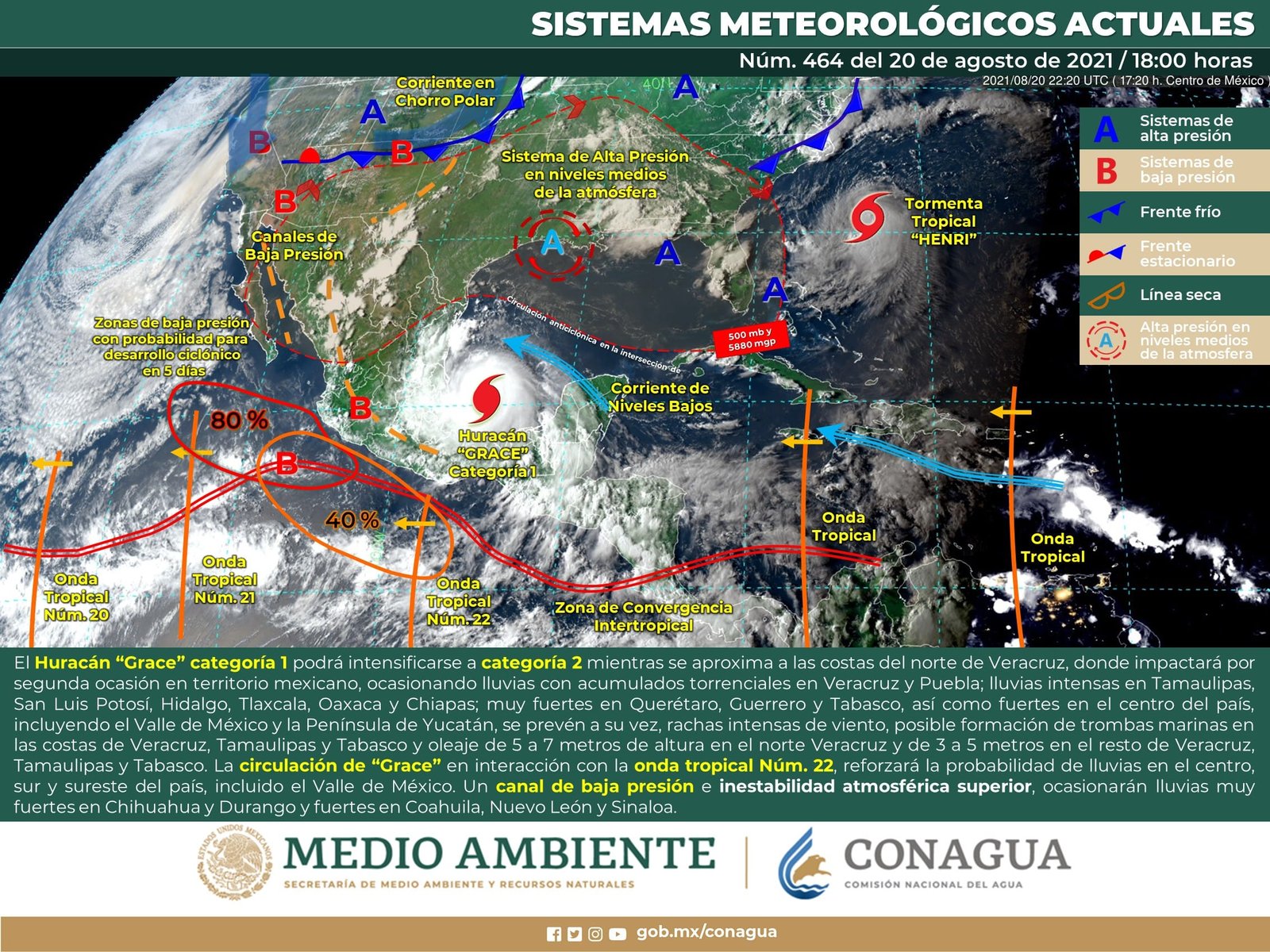Para el resto del país, el SMN dijo que la extensa circulación del ciclón tropical “Grace” interactúe con un canal de baja presión sobre el oriente del país, con la onda tropical 22 que recorrerá el sur del territorio nacional y con una zona de baja presión con potencial ciclónico que se desarrollará frente a las costas del Pacífico Sur Mexicano.
