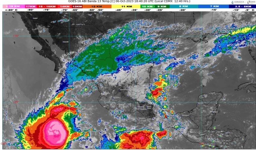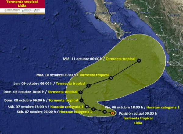 La tormenta tropical “Lidia” cambió de trayectoria y se dirige a las costas de Jalisco y Nayarit, informó el Servicio Meteorológico Nacional (SMN). El organismo dependiente de la Conagua precisó que el fenómeno podría impactar como huracán la próxima semana. El SMN indicó que “Lidia” se intensifica gradualmente y que su circulación genera ya chubascos en Baja California Sur y refuerza la probabilidad de lluvias fuertes a muy fuertes en el noroeste y occidente del país. Por el momento, el sistema está a unos 600 kms al oeste-suroeste de Manzanillo, Colima, y a 710 km al sur de Cabo San Lucas, Baja California Sur. Su desplazamiento es hacia el oeste-noroeste (295°) a 7 km/h y mantiene vientos máximos sostenidos de 110 km/h y rachas de 140 km/h. A EXTREMAR PRECAUCIONES El pronóstico del SMN es que la extensa circulación de “Lidia” ocasionará intervalos de chubascos en Baja California Sur, además de reforzar la probabilidad de lluvias muy fuertes en Sinaloa y Nayarit, así como lluvias fuertes en Jalisco. Para Guanajuato se mantiene el pronóstico de intervalos de chubascos en los próximos días. El SMN pidió extremar precauciones a la población en general y atender las recomendaciones emitidas por las autoridades del Sistema Nacional de Protección Civil, en cada entidad. La intensidad de “Lidia” lo llevaría a alcanzar la categoría 1 como huracán este mismo viernes, cuando se localice a 700 km al oeste-suroeste de Playa Perula, Jalisco. Compartir Navegación de entradas Dan Nobel de la paz a activista iraní encarcelada Laguna de Yuriria está en peligro de extinción