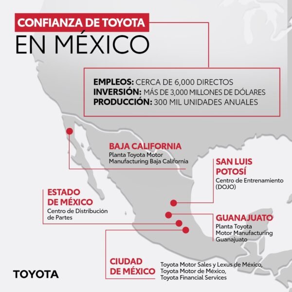 La poderosa firma automotriz japonesa Toyota anunció una inversión de mil 450 millones de dólares para fortalecer sus plantas de Guanajuato y Baja California. El anuncio se hizo a través de la Secretaría de Economía federal, en un comunicado y en sus redes sociales. Fue compartido por el titular de esa dependencia federal, Marcelo Ebrard. “Es una de las empresas con las que estamos trabajando más de cerca y más futuro tiene en nuestro país”, dijo el funcionario federal en un video donde aparece acompañado de Luis Lozano, presidente de la empresa japonesa en México. El directivo de la firma puntualizó que esta inversión es adicional a las que ya están en marcha en México y que, asegura, suman ya los casi 2 mil millones de dólares al cierre de 2024 y tomando en cuenta los 22 años de presencia de la armadora japonesa en el país. MÁS EMPLEOS “La industria automotriz debe seguir siendo un motor para el desarrollo”, escribió el directivo en su cuenta de X. La inversión será destinada a la producción de la nueva generación de la pick-up Tacoma y Tacoma híbrida eléctrica (HEV) y dará paso a la creación de mil 600 nuevos empleos, consignó el diario El País. La armadora japonesa tiene presencia en México con 98 puntos de venta en los que comercializa 18 de sus modelos. Además, con su división de manufactura, Toyota Motor Manufacturing tiene las plantas de producción en Tijuana, Baja California y en Apaseo el Grande, en Guanajuato. Toyota llegó a México en abril de 2002. El anuncio de esta nueva inversión se da tras la victoria de Donald Trump para la presidente estadounidense. (Foto y gráfica: Tomada de El País y Llozano_Toyota) Compartir Navegación de entradas Nuevo bulevar genera miles de empleos en 2 municipios Se prepara Guanajuato para recibir a paisanos