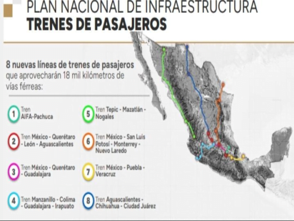 El ferrocarril de pasajeros México-Querétaro-León-Aguascalientes será el segundo con mayor demanda para los próximos años. Así está contemplado en la estrategia de “Prosperidad Compartida” planteada por la virtual presidenta electa, Claudia Sheinbaum, que adelanta un auge en las vías férreas, tanto de carga como de pasajeros. Según la estrategia citada por el diario Excélsior, la red de trenes de pasajeros utilizará los derechos de vía ya existentes y cuyas concesiones permiten la convivencia del tren de carga -ya en operación- con el de pasajeros. Mediante ese esquema compartido se tiene planeado que se habiliten o modernicen hasta 18 mil kilómetros de vías férreas para trenes de pasajeros. RAMAL EN EL AIFA En el Plan Nacional de Infraestructura, se tiene planteado que del Aeropuerto Internacional Felipe Ángeles (AIFA) haya un ramal de tren de pasajeros hacia Pachuca, Hidalgo. El próximo gobierno hará las licitaciones necesarias para que se concrete el retorno del tren de pasajeros de la Ciudad de México a Querétaro y de ahí a León y Aguascalientes. Otro ramal conectará la Ciudad de México a Querétaro y de ahí a Guadalajara. Otra línea irá de Manzanillo a Colima, posteriormente a Guadalajara y de ahí a Irapuato. La línea más larga que se contempla en el plan de infraestructura es de Tepic, Nayarit, a Mazatlán y llegará hasta Nogales, Sonora. También se contempla Ciudad de México a San Luis Potosí, de ahí a Monterrey y finalmente a Nuevo Laredo, Tamaulipas, en la frontera con Estados Unidos. (Fotos y gráfico: Tomadas de Expansión y Excélsior) Compartir Navegación de entradas ONU: México, país donde más se producen drogas sintéticas Reconocen con laptops y tabletas a genios de matemáticas y ciencias