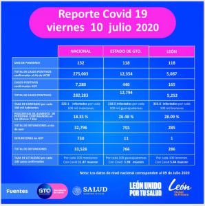 🔊 Escuchar esto La Secretaría de Salud federal reportó la noche de este viernes 665 nuevas muertes por coronavirus Covid-19 en el país, con lo que suman 34 mil 191, mientras que los contagios llegaron a 289 mil 174 casos acumulados, 6 mil 891 más que el jueves. La Secretaría de Salud de Guanajuato (SSG) reportó a su vez 11 nuevos decesos y la cifra de contagios se acerca a los 13 mil. [read more=”Leer más” less=”Leer menos”] 🔊 Nota completa Con los más de 34 mil defunciones reportadas este viernes, México se acerca a Italia como el cuarto país con más decesos a nivel mundial. Italia registra 34 mil 938, según cifras de la Universidad Johns Hopkins. En conferencia desde Palacio Nacional, el subsecretario de Salud federal, Hugo López-Gatell, informó que hay un 45 por ciento de ocupación hospitalaria promedio a nivel nacional. Mencionó que Tabasco encabeza la lista con más ocupación, con un 81 por ciento, por lo que ya se está ampliando la capacidad hospitalaria. En tanto, la ocupación de camas con ventilador es de 38 por ciento a nivel nacional. El funcionario advirtió que México está en la parte más alta de una epidemia de Covid-19. “No nos podemos sustraer a esta realidad, la nueva normalidad lo que implica es la conciencia de que tenemos que cuidar todos los días y las horas del día lo que hacemos”, señaló. SIN SEMÁFORO López-Gatell indicó que no se presentará el semáforo epidemiológico nacional de Covid-19 debido a que la información en algunos estados es inconsistente. “Quiero comunicar que hoy es viernes y hoy esperábamos ver un semáforo. Decidimos hoy no presentar un semáforo. ¿Por qué razón? Porque identificamos que la información que se transfiere para evaluar el semáforo no es consistente en todos los estados”, comentó. López-Gatell añadió que en la semana se consideró la posibilidad de que hubiera un desfase en las bases de datos. “Nos damos cuenta que no (hay desfase). Hay inconsistencias. Vamos a revaluar y a platicar con las entidades federativas al respecto”, agregó. En tanto, en el mundo suman más de 12 millones 439 mil casos confirmados y unas 558 mil 562 defunciones, de acuerdo datos de la Universidad Johns Hopkins. GUANAJUATO CON 766 DECESOS En su última actualización, la Secretaría de Salud de Guanajuato reportó 440 positivos y 11 defunciones más para llegar a 12 mil 794 positivos y 766 defunciones, respectivamente. En solo una semana se reportaron mil 890 casos positivos siendo León el municipio que sigue a la cabeza en contagios y muertes. León tiene un total de 5 mil 252 lo que representa el 41.05 por ciento de contagios en todo el estado y suma 284 muertos. Las defunciones por municipio quedan así: León 286 Celaya 97 Silao 61 Irapuato 58 Salamanca 39 Romita 23 Juventino Rosas 21 Cortazar 18 Sn. Luis de la Paz 12 Sn. Fco. Del Rincón 11 Pénjamo 11 Guanajuato capital 10 Acámbaro 9 Apaseo el Grande 9 Dolores Hidalgo 9 Sn. Miguel de Allende 9 Moroleón 8 Salvatierra 8 Valle de Santiago 8 Villagrán 8 Apaseo el Alto 6 Abasolo 4 Purísima del Rincón 4 San José Iturbide 4 Uriangato 4 Comonfort 3 Doctor Mora 3 Santiago Maravatío 3 Yuriria 3 Jaral del Progreso 2 Ocampo 2 San Felipe 2 Tarandacuao 2 Cuerámaro 1 Huanímaro 1 Jerécuaro 1 Manuel Doblado 1 Sn. Diego de la Unión 1 Tarimoro 1 Tierra Blanca 1 Victoria 1 Xichú 1 [/read] Compartir