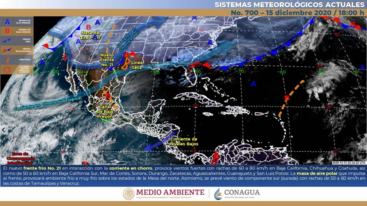 🔊 Escuchar esto Este miércoles, Guanajuato tendrá muy bajas temperaturas en la madrugada y noche, dio a conocer el Servicio Meteorológico Nacional (SMN). De acuerdo con su último reporte, el organismo dependiente de la Conagua pronostica que para la Mesa Central del país se presente ambiente frío con posibles heladas matutinas en sierras de la región. El cielo estará medio nublado por la tarde con lluvias puntuales fuertes solo en el estado de Puebla. Para el resto de la región no se esperan lluvias, mientras que el viento se mantendrá del sur y suroeste de 10 a 25 km/h. GUANAJUATO CON HELADAS El reporte del SMN indica que los municipios de San Felipe, San Luis de la Paz, San Miguel de Allende, Victoria, Doctor Mora y San José Iturbide tendrán mínimas de 2 grados durante la madrugada y noche. El resto de municipios del estado registrarán máximas de 24 a 25 grados con cielos despejados y casi nula probabilidad de lluvia. Las mínimas en el resto de Guanajuato oscilarán entre los 7 y 8 grados, añadió el reporte para este miércoles. MASA DE AIRE POLAR EN EL CENTRO Para el resto del país, el SMN dijo que el frente frío No. 21 recorrerá el oriente y sureste del territorio nacional, ocasionando lluvias fuertes a puntuales intensas en dichas regiones, además de chubascos en la Península de Yucatán. La masa de aire polar que lo impulsa, provocará ambiente frío a muy frío en gran parte del país, con heladas matutinas sobre entidades de la Mesa del Norte y la Mesa Central, previéndose temperaturas mínimas inferiores a los -10°C en Chihuahua y Durango durante la madrugada. Asimismo, se presentará evento de “Norte” de muy fuerte a intenso a lo largo del litoral del Golfo de México, Istmo y Golfo de Tehuantepec. Los sistemas meteorológicos ocasionarán este miércoles: Lluvias muy fuertes con lluvias puntuales intensas (75 a 150 mm) acompañadas de descargas eléctricas y rachas fuertes de viento durante las tormentas en los estados de Veracruz (sur), Oaxaca (norte y oriente), Chiapas (norte) y Tabasco. Intervalos de chubascos con lluvias puntuales fuertes (25 a 50 mm) acompañadas de descargas eléctricas y rachas fuertes de viento durante las tormentas en Puebla. Intervalos de chubascos (5.1 a 25 mm) acompañados de descargas eléctricas y rachas fuertes de viento durante las tormentas en Campeche, Yucatán y Quintana Roo. Lluvias aisladas (0.1 a 5.0 mm) en Guerrero. Evento de “Norte” con rachas de 80 a 100 km/h en el litoral centro y sur de Veracruz, Istmo y Golfo de Tehuantepec, con rachas de 60 a 70 km/h en las costas de Tamaulipas y Tabasco. Oleaje de 2 a 4 metros de altura significativa en litoral centro y sur de Veracruz y Golfo de Tehuantepec, y de 1 a 3 metros de altura significativa en las costas de Tamaulipas. Viento con rachas de 50 a 60 km/h en Baja California y Mar de Cortés. Temperaturas máximas de 35 a 40°C en Michoacán y Guerrero. Temperaturas mínimas para la madrugada del jueves de -15 a -10°C con heladas en las zonas montañosas de Chihuahua y Durango. Temperaturas mínimas para la madrugada del jueves de -10 a -5°C con heladas en las zonas montañosas de Sonora y Coahuila. Temperaturas mínimas para la madrugada del jueves de -5 a 0°C con heladas en zonas montañosas de Baja California, Nuevo León, Tamaulipas, San Luis Potosí, Zacatecas, Aguascalientes, Michoacán, Guanajuato, Estado de México y Puebla. Temperaturas mínimas para la madrugada del jueves de 0 a 5°C y posibles heladas en zonas montañosas de Jalisco, Querétaro, Hidalgo, Tlaxcala, Ciudad de México y Veracruz. Compartir