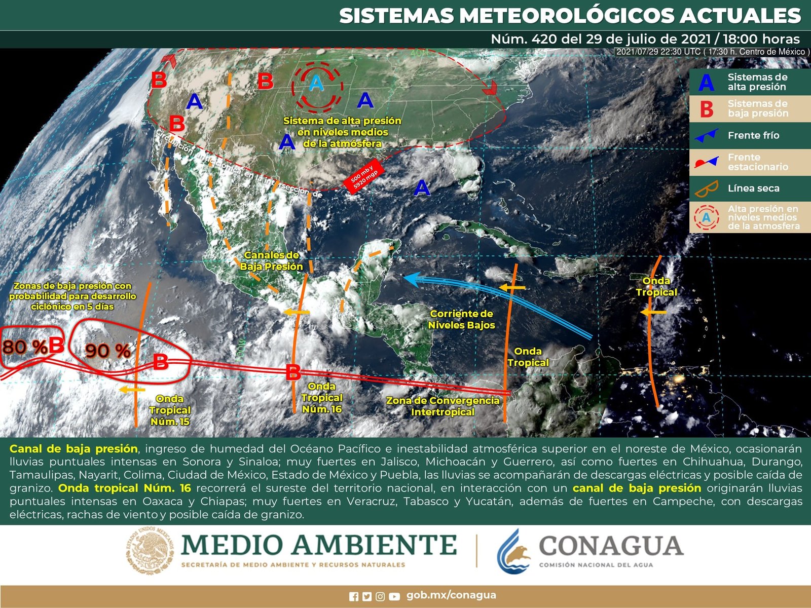 🔊 Escuchar esto Guanajuato tendrá este viernes día con nublados y probables intervalos de lluvia a lo largo de la noche, dio a conocer el Servicio Meteorológico Nacional (SMN). De acuerdo con su último reporte, el organismo dependiente de la Conagua pronostica que la Mesa Central del país registrará cielo medio nublado por la mañana, mientras que por la tarde se incrementará la nubosidad y se pronostican lluvias puntuales fuertes en Puebla; intervalos de chubascos en Guanajuato, Querétaro, Hidalgo, Tlaxcala y Morelos. Se espera viento del este y noreste de 15 a 30 km/h acompañado rachas de 50 a 60 km/h en Guanajuato y Puebla. VIENTO NOCTURNO EN GUANAJUATO El reporte indica que Guanajuato registrará día con temperaturas máximas promedio de 26 a 28 grados en la mayoría de los municipios. Los nublados se presentarán en la tarde y los intervalos de chubascos se presentarán principalmente en las zonas del noroeste y centro del estado como Pénjamo, Manuel Doblado, Irapuato, Salamanca, Valle de Santiago y Yuriria. Los municipios de León, Guanajuato capital, Dolores Hidalgo, Comonfort y Celaya tendrán probabilidad de 25-30 por ciento de lluvia, pero fuertes rachas de viento nocturnas. Las temperaturas mínimas promedio en la entidad serán de 12 grados, aunque en el noreste se esperan 10 y 11 grados durante la noche y madrugada del sábado. LLUVIAS EN EL SUR Y CENTRO Para el resto del país, el SMN pronostica que un canal de baja presión se extenderá a lo largo de Sierra Madre Occidental. Este fenómeno interaccionará con el paso de la onda tropical Núm. 16 que recorrerá el sur y centro del territorio nacional, aunado a divergencia en altura, ocasionando chubascos y lluvias fuertes a muy fuertes acompañadas de descargas eléctricas y posibles granizadas en el noroeste, norte, occidente, centro y sur del país. HUMEDAD EN EL ORIENTE Y SURESTE Por otra parte, un canal de baja presión sobre el sureste del país, en interacción con el ingreso de humedad del Océano Pacífico y Golfo de México, incrementará la probabilidad de chubascos y lluvias fuertes a muy fuertes con descargas eléctricas en el oriente y sureste del país, pronosticándose tormentas puntuales intensas en Oaxaca. CALUROSO EN EL NOROESTE Asimismo, se mantendrá el ambiente caluroso a muy caluroso con temperaturas máximas de 35°C a 40°C en zonas del noroeste, occidente, norte, noreste y oriente de la República Mexicana, así como en la Península de Yucatán. Los fenómenos meteorológicos mencionados traerán este viernes: Lluvias fuertes con lluvias puntuales muy fuertes (50.1 a 75.0 mm) en los estados de Oaxaca, Baja California Sur, Sinaloa, Nayarit, Jalisco, Michoacán, Guerrero y Veracruz. Intervalos de chubascos con lluvias puntuales fuertes (25.1 a 50.0 mm) en Baja California, Sonora, Chihuahua, Durango, Colima, Estado de México, Puebla, Tabasco y Chiapas. Intervalos de chubascos (5.1 a 25.0 mm) en Coahuila, Nuevo León, Tamaulipas, San Luis Potosí, Zacatecas, Guanajuato, Querétaro, Hidalgo, Tlaxcala, Ciudad de México, Morelos, Campeche, Yucatán y Quintana Roo. Posible caída de granizo en Baja California Sur, Baja California, Sonora, Chihuahua, Durango, Sinaloa, Jalisco, Estado de México, Ciudad de México, Morelos y Guerrero. Posibilidad de tormentas eléctricas en Baja California Sur, Baja California, Sonora, Chihuahua, Coahuila, Nuevo León, Tamaulipas, San Luis Potosí, Zacatecas, Durango, Sinaloa, Nayarit, Jalisco, Colima, Michoacán, Guerrero, Morelos, Ciudad de México, Estado de México, Tlaxcala, Puebla, Hidalgo, Veracruz, Oaxaca, Chiapas, Tabasco, Campeche y Yucatán. Viento con rachas de 50 a 60 km/h en Baja California, Sonora, Chihuahua, Coahuila, Nuevo León, Tamaulipas, San Luis Potosí, Zacatecas, Durango, Aguascalientes, Jalisco, Guanajuato, Puebla, Campeche, Yucatán e Istmo y Golfo de Tehuantepec. Temperaturas máximas de 35 a 40 °C en Baja California Sur, Baja California, Sonora, Sinaloa, Coahuila, Nuevo León, Tamaulipas, Tabasco, Campeche, Yucatán y Quintana Roo. Temperaturas mínimas para la madrugada del sábado de 0 a 5 °C y posibles heladas en zonas montañosas del Estado de México, Hidalgo, Tlaxcala y Puebla. Compartir