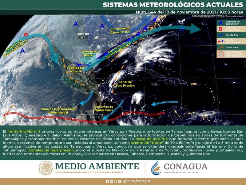 Para el resto del país, el SMN dijo que el frente frío 9 se extenderá sobre el centro, oriente y sureste de la República Mexicana.